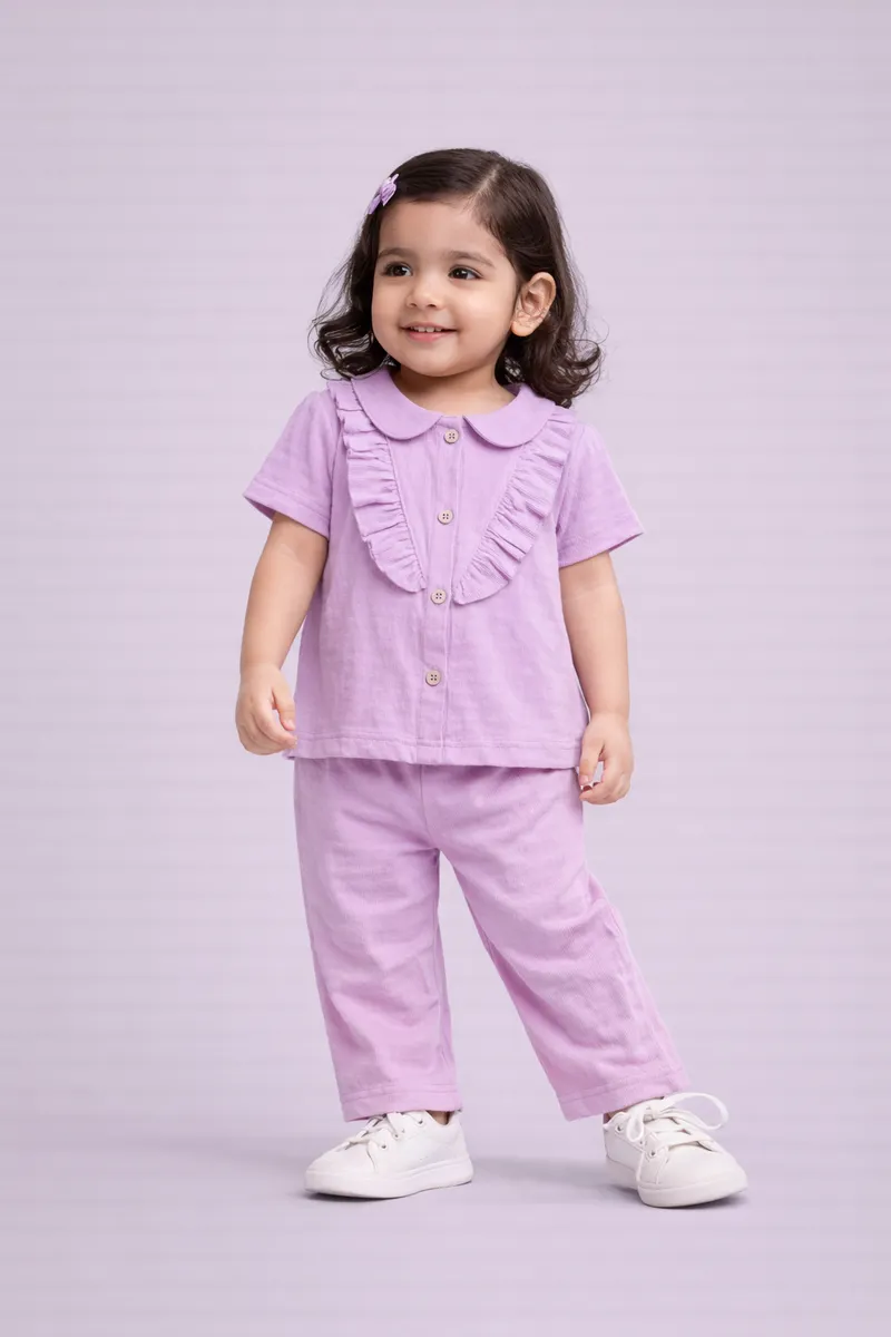 Soft pastel co-ord sets crafted in breathable cotton with gentle textures, ruffle detailing, and easy buttons.