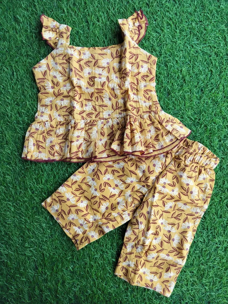 This adorable frill cap sleeve top with an adjustable loop pairs perfectly with comfy 3/4 capris featuring a soft elastic waist.