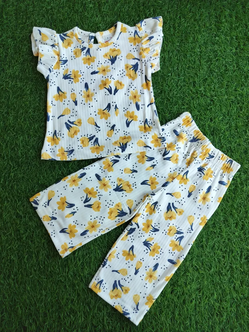 Adorable frill-sleeve top paired with comfy palazzo pants for an effortlessly elegant look.